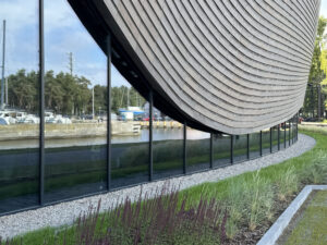 Z tej idei zrodziła się zwarta, dynamiczna bryła i elewacja – główny element koncepcji – której forma, wypracowana już na etapie konkursu, koduje cały ten szereg skojarzeń. W miejscu wejścia głównego krzywizna poderwanej fasady tworzy zapraszający gest otwarcia. Drewniana bryła unosi się delikatnie nad terenem, a jej miękkie linie pozwalają przechodniom zaglądać do wnętrza strefy ekspozycyjnej. Z dalszej perspektywy fasada przypomina ruch fali, z bliska zaś ujawnia swoją rzeźbiarską złożoność, gra światłocienia i refleksów potęguje wrażenie, że budynek żyje w rytmie otaczającej go wody i wiatru.