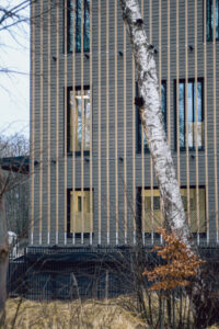 Drewno, świadomie wybrane jako główny materiał, pełni tu funkcję zarówno strukturalną, jak i symboliczną. Jego naturalna nieregularność, podatność na światło i wilgoć sprawiają, że fasada nie jest statyczna: w słońcu przybiera złociste odcienie, w pochmurne dni staje się grafitowa, a z czasem pokrywa się delikatną patyną. Modrzew syberyjski będzie stopniowo zmieniał kolor, upodabniając się do piasku, bursztynu i wypłowiałych desek portowych – materiałów wpisanych w tożsamość wybrzeża.