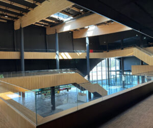 Wnętrza utrzymano w tonacji naturalnych materiałów – drewna, betonu i stali – w sposób spójny z zewnętrzną estetyką obiektu. Naturalne światło, wpadające przez świetliki dachowe i przeszklenia od strony kanału, podkreśla organiczny charakter przestrzeni, jednocześnie tworząc atmosferę bliskości z naturą i wodą.