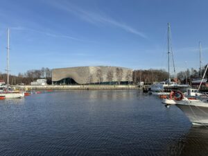 Z czasem do kutra dołączyły także inne wielkogabarytowe zabytki – silniki statków morskich. W kolejnych miesiącach wznoszono drewniane dźwigary o długości 35 m, wykonano dach ze świetlikami, a następnie zamknięto kubaturę budynku ścianami z drewnianą okładziną. Montaż wielokrzywiznowej fasady stanowił kulminację procesu, w którym zmaterializowały się cyfrowe modele i inżynierska matematyka.