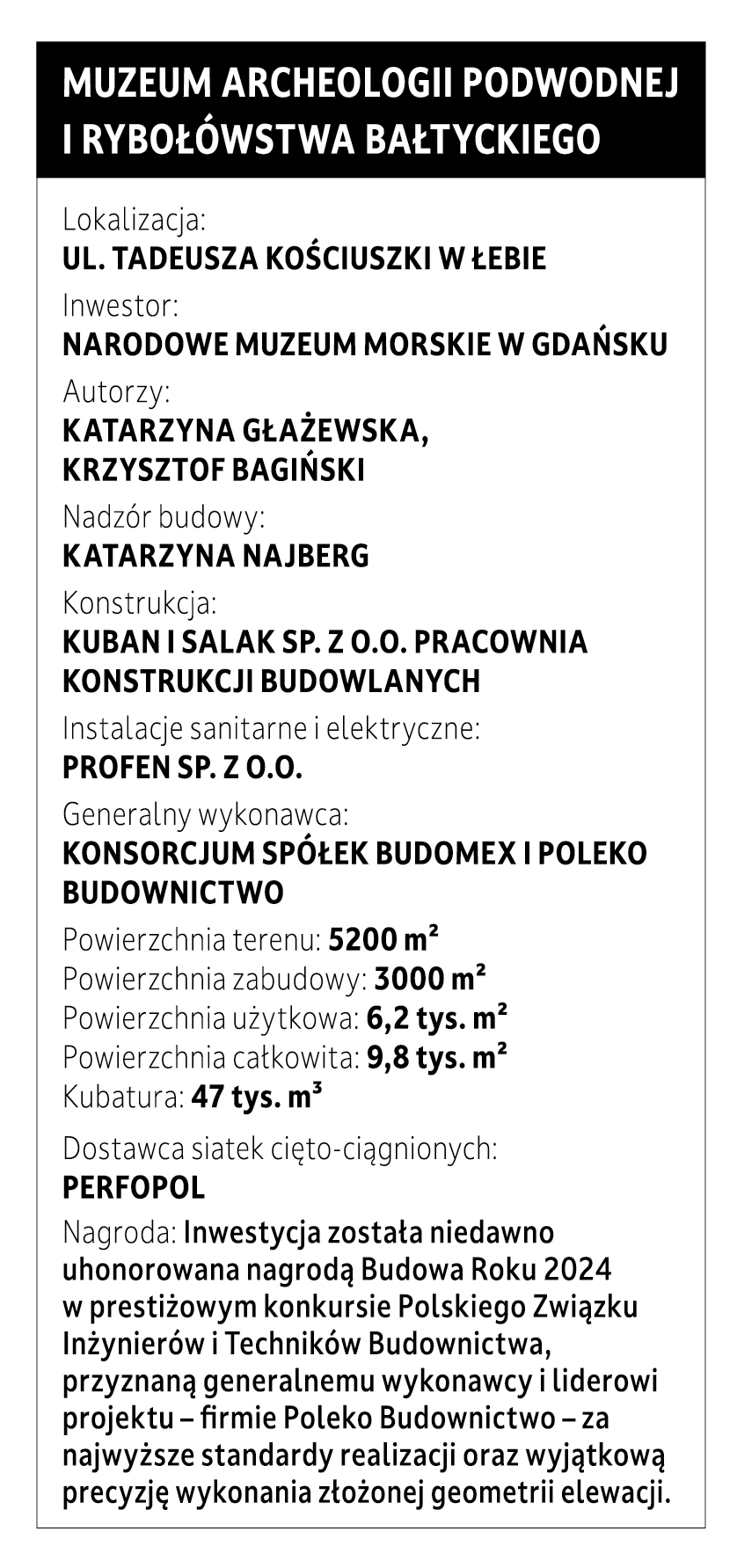 Nowy budynek Narodowego Muzeum Morskiego w Łebie nie jest jedynie obiektem ekspozycyjnym, lecz otwiera także nowy etap w popularyzacji dziedzictwa morskiego Polski. Jego forma, zakorzeniona w pejzażu ujścia rzeki, łączy w sobie artystyczną ekspresję, inżynierską precyzję i wrażliwość na kontekst. Chcieliśmy udowodnić, że architektura – nawet w tak wymagającym środowisku jak nadmorskie – może być technicznie zaawansowana i głęboko humanistyczna.