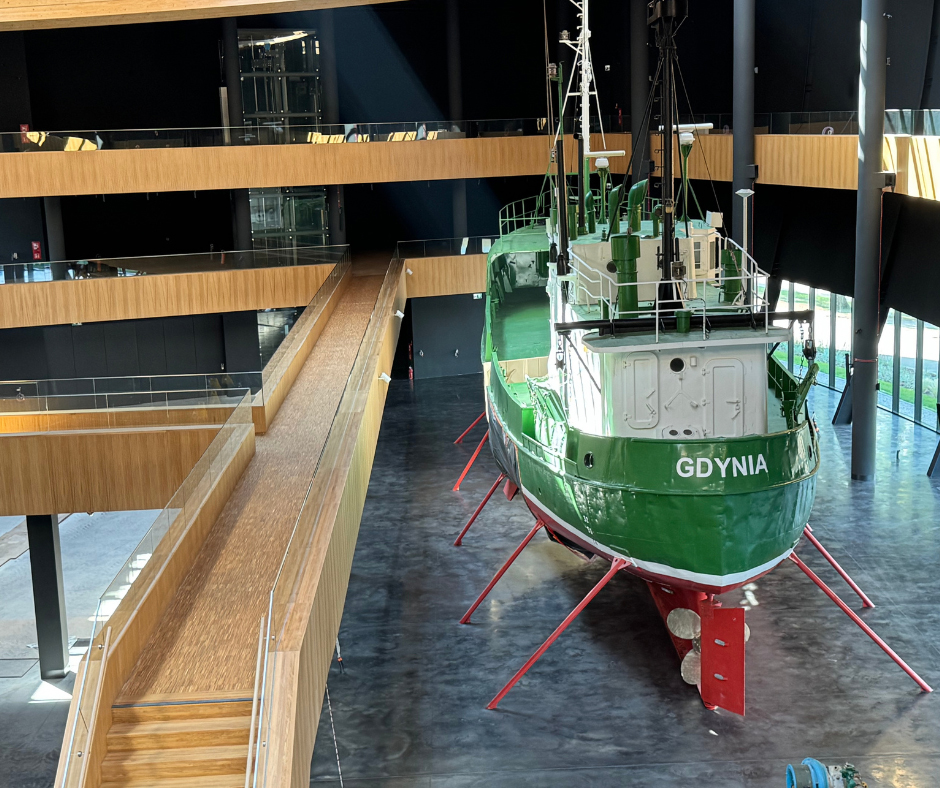 Wnętrza muzeum pomieszczą wystawę stałą, strefy edukacyjne oraz zaplecze techniczne, tworząc kompleksową strukturę funkcjonalną. W 2021 r. nasza pracownia, wspólnie z PL Studio Patryk Żurawski, zwyciężyła w konkursie na projekt wystawy stałej i zaprojektowała całe założenie. Inwestycja uzyskała znaczące dofinansowanie z Europejskiego Funduszu Rozwoju Regionalnego, co umożliwi realizację nowoczesnej przestrzeni odkrywającej tajemnice podwodnego świata i historię rybołówstwa na Bałtyku.