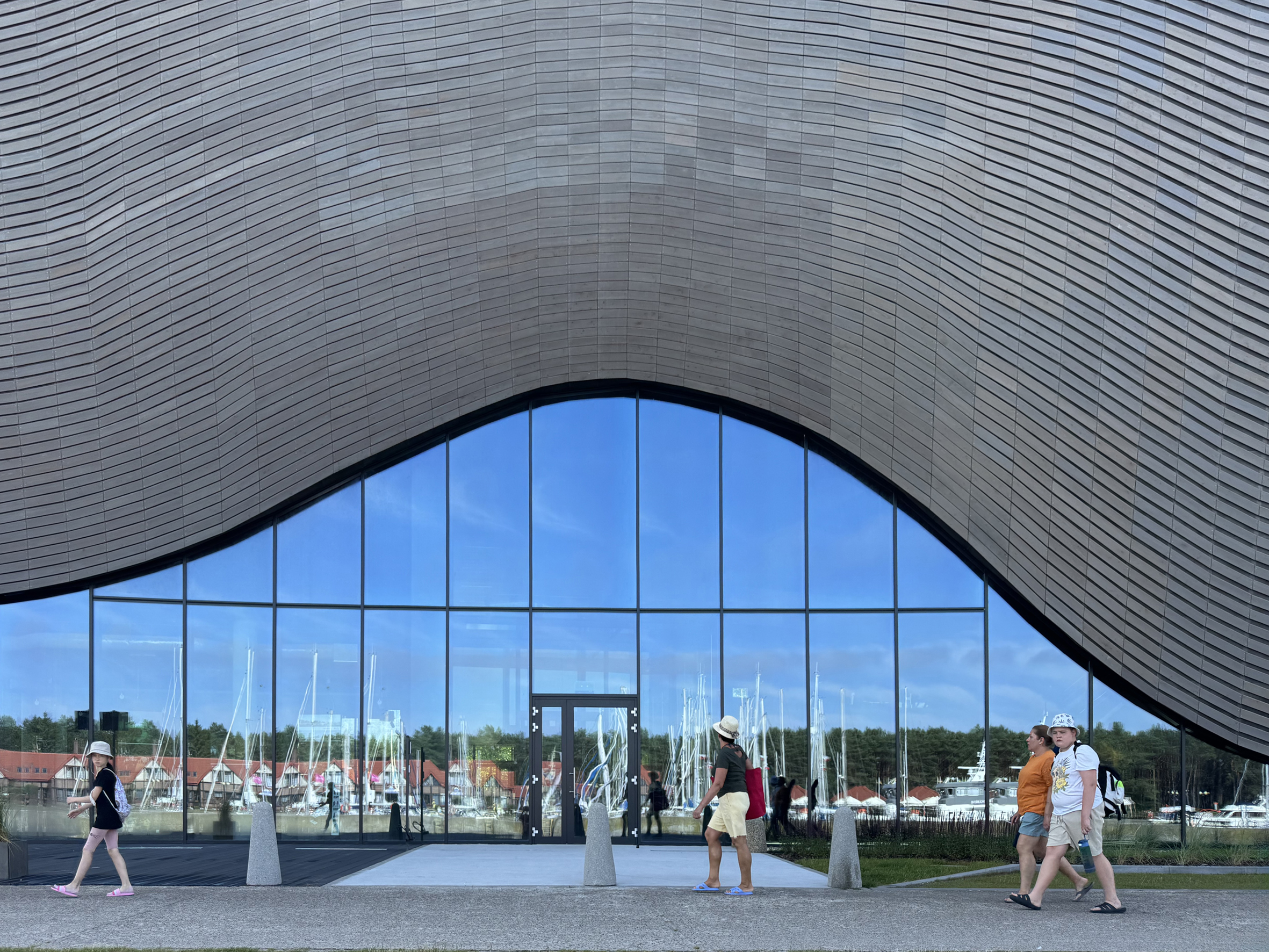 Frontowa fasada to swoisty „rzeźbiarski ekran”, który od początku miał łączyć w sobie artystyczną ekspresję i technologiczną precyzję. Uformowana jako powierzchnia dwukrzywiznowa została wykonana z modrzewia syberyjskiego i oparta na złożonej, stalowo-drewnianej konstrukcji nośnej. Jej długość – blisko 90 m – i trzymetrowe nadwieszenie nad terenem sprawiają, że bryła zdaje się lewitować nad nabrzeżem, jednocześnie zachowując płynność i lekkość formy.