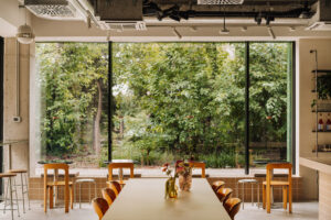 Ponadto Helen Cafe stało się mocnym punktem na gastromapie Wrocławia, ponieważ inwestorzy chcieli stworzyć przestrzeń społecznościową łączącą różne funkcje i grupy użytkowników. Odpowiedzieliśmy na te potrzeby elastycznym układem wnętrza. Najciekawsze rozwiązania w projekcie powstały z potrzeby zmienności i mobilności elementów. Podesty, które służą jako ekspozycja roślin, mogą w każdej chwili stać się lożami lub stołami warsztatowymi. Community table, czyli główny stół lokalu, można dostosować do liczby uczestników i wykorzystać do obsługi warsztatów, a innym razem może stanowić on miejsce spotkań dla blisko trzydziestu osób. Z kolei elastyczny front bar pozwala na swobodną aranżację przestrzeni bez utraty funkcjonalności obsługi. Cała technologia pozostaje w back barze, a reszta lokalu może pełnić dowolną funkcję.