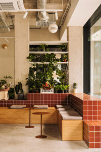 Projekt wnętrza w Helen Cafe to także odpowiedź na problem integracji z lokalnym kontekstem i historią dzielnicy. Wybrana paleta materiałów, od ciemnoceglastych kafli, przez jasne odcienie bieli, po naturalne drewno i beton, nawiązuje zarówno do przedwojennej tkanki wrocławskiego Borka, jak i powojennego modernizmu. Rośliny wkomponowane w podesty i przestrzeń witryn tworzą naturalne przedłużenie zielonego otoczenia, które widać przez ogromne przeszklenia. Można odnieść wrażenie, że przebywa się w ogrodzie.