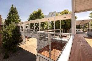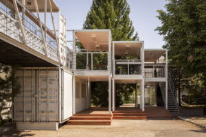 Inwestor oczekiwał przestrzeni, która będzie mogła ewoluować w czasie i odpowiadać na różne formaty działalności. Huta została więc zaprojektowana jako modułowy organizm – ponad 30 kontenerów, w tym 10 gastronomicznych, tworzących system, w którym każda jednostka zachowuje odrębność, ale jednocześnie współtworzy spójną całość. Strefy chilloutu, eventów, rekreacji i usług naturalnie się przenikają, a dodatkowe przejścia na poziomie +1 pozwalają na płynne poruszanie się gości między piętrami.
