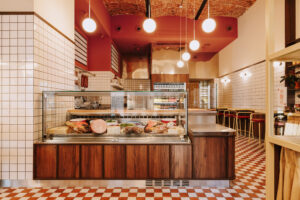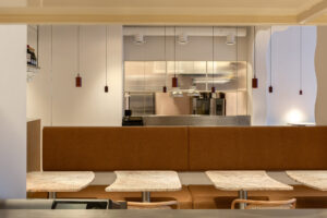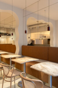 Również w tym przypadku inwestorzy oczekiwali kompleksowego podejścia – od projektu wnętrz, przez branding, po storytelling. Współpraca ze studiem brandingowym pozwoliła wykreować całościowo markę Marietta – zarówno nazwę, osobowość, jak i brand hero, łączącego włoski luz, serdeczność i jakość. Metraż lokalu, wynoszący 61 m², wymagał maksymalnego wykorzystania przestrzeni przy bardzo dużym natężeniu ruchu. Postawiono na wysokie siedziska i montowane na ścianach blaty stolikowe bez nóg, co zwiększyło liczbę miejsc, nie ograniczając komfortu gości. Lada barowa z witryną chłodniczą została zaprojektowana tak, by produkty były eksponowane centralnie, a jednocześnie obsługa mogła działać sprawnie nawet przy dużym napływie klientów.