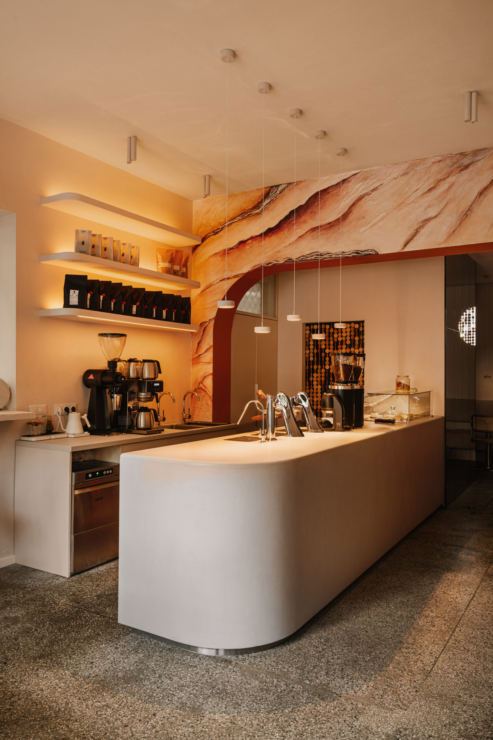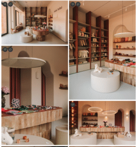 Projekt wnętrza sklepu odpowiada na to wyzwanie poprzez całe doświadczenie przestrzeni. Centralnymi punktami lokalu są wymurowana lada i stół ekspozycyjny o organicznych, miękkich formach, wykończone cegłą w odcieniach terakoty i mikrocementem. Wnętrze zaprojektowano tak, aby eksponowało produkty w kontekście luksusowej estetyki, a jednocześnie zapewniało funkcjonalność personelowi i elastyczność aranżacji. Regały z regulowanymi półkami i podesty ekspozycyjne pozwalają na zmiany ekspozycji w zależności od sezonu czy promocji. Materiały i kolorystyka odpowiadają strategii budowania wartości premium – jasne tony złamanej bieli, ciepłe drewno, subtelne odcienie cegły. Całość podkreślają detale, takie jak organiczna struktura ściany dekoracyjnej czy designerskie lampy.