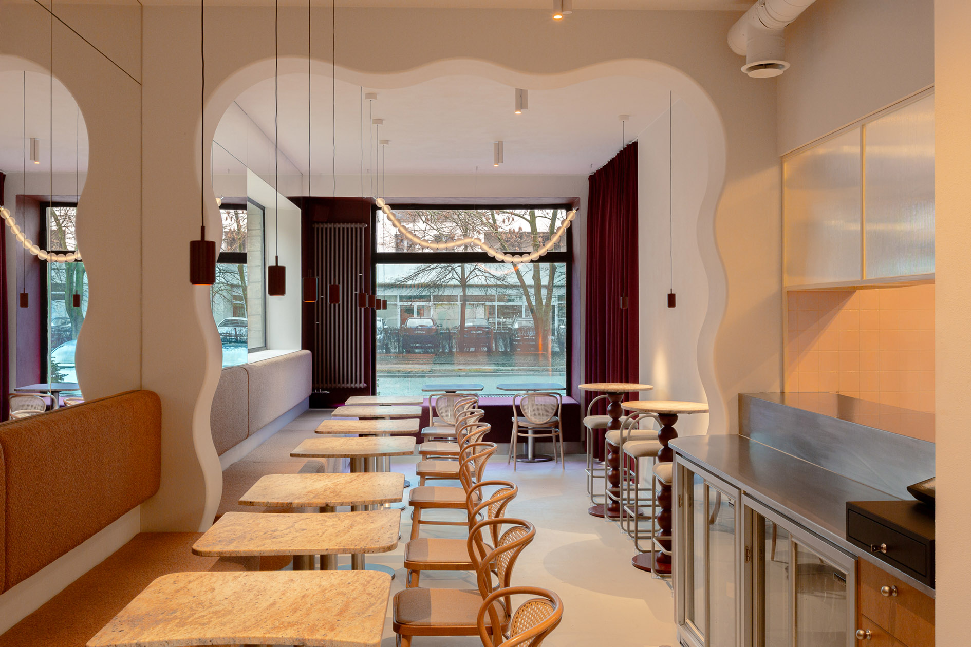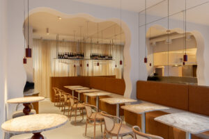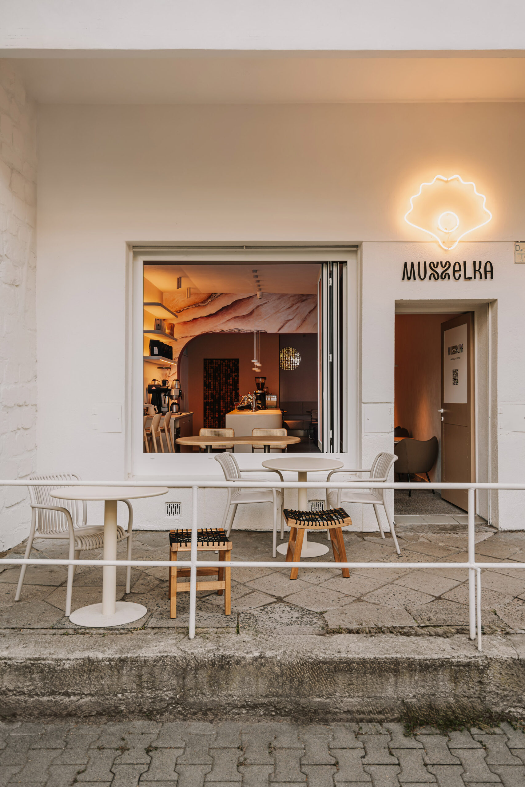 Na Saskiej Kępie, w odrestaurowanym modernistycznym pawilonie, powstały dwa bliźniacze lokale: kawiarnia Muszelka i bistro Perełka. Dwa koncepty funkcjonują niezależnie, generując wzajemny ruch i przyciągając różnorodną grupę gości. Jednym z kluczowych wyzwań była niewielka powierzchnia (Muszelka ma zaledwie 50 m², Perełka 54 m²), przy czym oba lokale musiały pomieścić strefę serwowania, miejsca do siedzenia i otwarte kuchnie. Zastosowano tu wiele rozwiązań, które maksymalizują funkcjonalność, np. podłużne ustawienie stolików, centralne bary oraz subtelne podziały przestrzeni za pomocą portalu czy lustra.