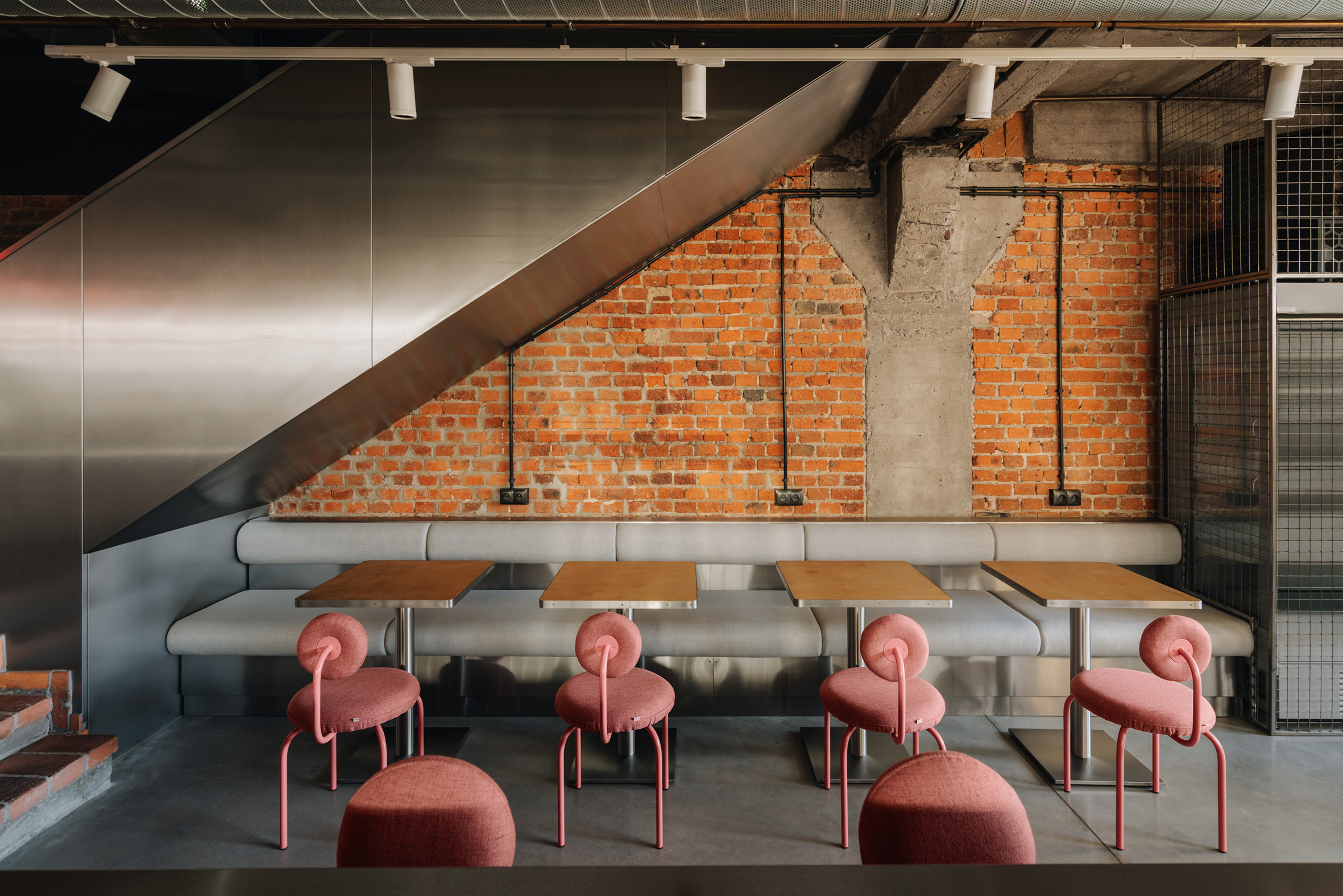 Głównym zadaniem było połączenie industrialnego charakteru miejsca z nowoczesnym, przyciągającym tłem dla zróżnicowanych lokali gastronomicznych. Zastosowano beton, drewno, cegłę i metal w różnych formach (blacha trapezowa, corten, siatki plecione), utrzymując konstrukcje stalowe w neutralnym odcieniu. Takie rozwiązanie zapewniało inwestorowi uniwersalną bazę, na której najemcy i artyści mogą tworzyć własne aranżacje, nie naruszając spójności przestrzeni. Wyzwaniem było też wkomponowanie naturalnego krajobrazu miejskiego – drzew, spadków terenu, studzienek i latarni – w sposób, który nie ogranicza funkcjonalności przestrzeni.