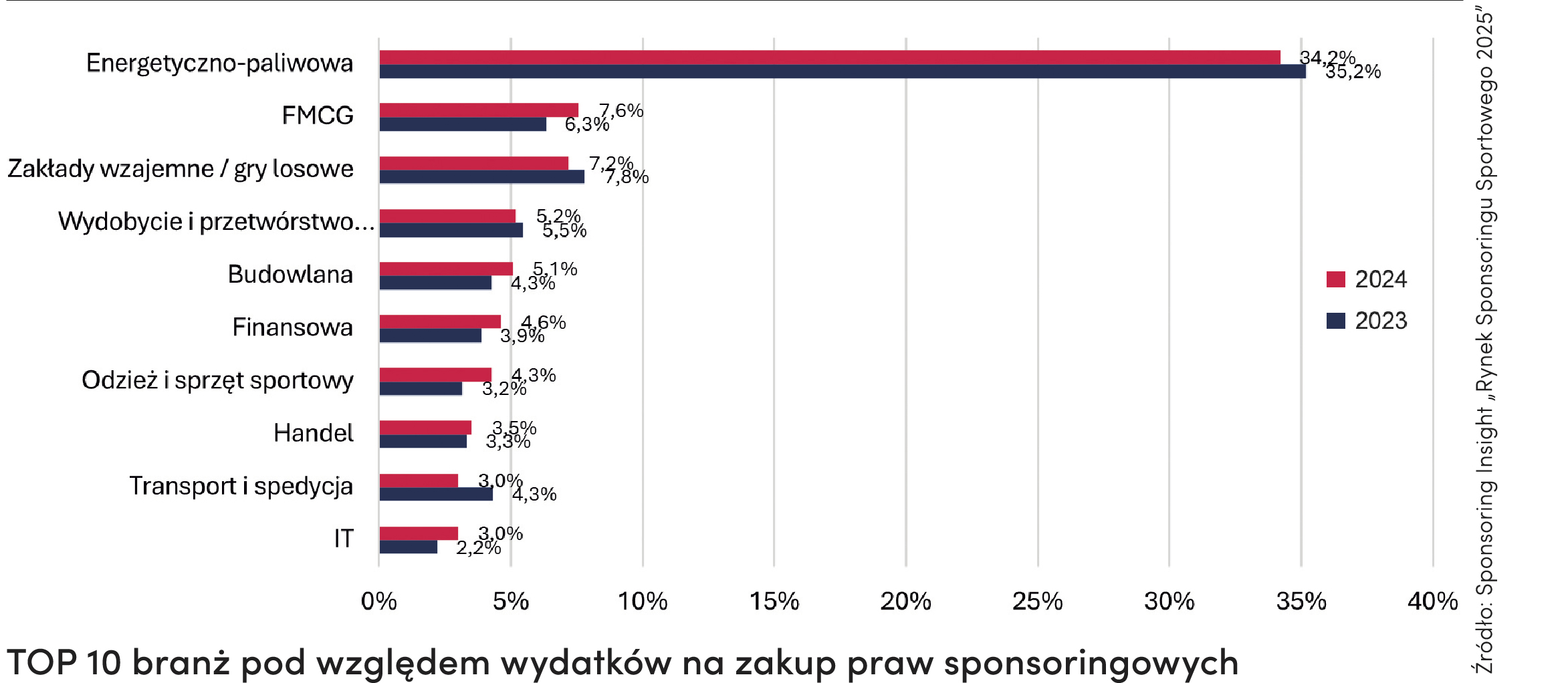 Na czele klasyfikacji sponsorów pozostają tradycyjnie sektory energetyczno-paliwowy, FMCG oraz zakłady wzajemne i gry losowe. Jednak dane z raportu Sponsoring Insight pokazują, że branża budowlana – choć niereprezentowana szeroko przez spółki z udziałem Skarbu Państwa – stała się jednym z pięciu najważniejszych sektorów finansujących polski sport. Duża w tym zasługa nie tylko pierwszoplanowych aktorów, takich jak Atlas, Bruk-Bet czy Aluron, ale też niezliczonych kontraktów mniejszych graczy, których łączny wolumen stanowi o sile całej branży i jej wpływie na rozwój krajowego rynku sponsoringu.
