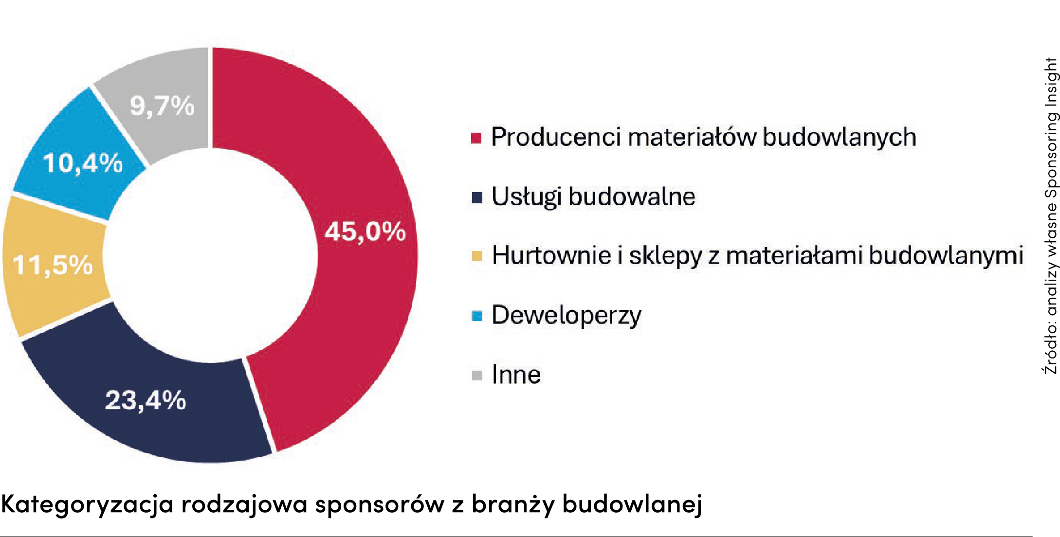 Według autorów raportu firmy budowlane odpowiadają za 5,1 proc. całego sponsoringu sportowego w Polsce, a w ich skład wchodzą zarówno klasyczne przedsiębiorstwa wykonawcze, deweloperzy i inwestorzy, jak i producenci materiałów budowlanych, HVAC czy OZE. Jeśli jednak zliczyć szeroki ekosystem okołobudowlany, w tym hurtownie i sieci marketów, firmy IT dostarczające oprogramowanie i technologię dla budownictwa czy producentów elektroniki, wynik ten pozwoliłby wyprzedzić wydobycie i przetwórstwo surowców naturalnych (reprezentowane przez takich gigantów jak KGHM czy JSW) i powalczyć o podium.