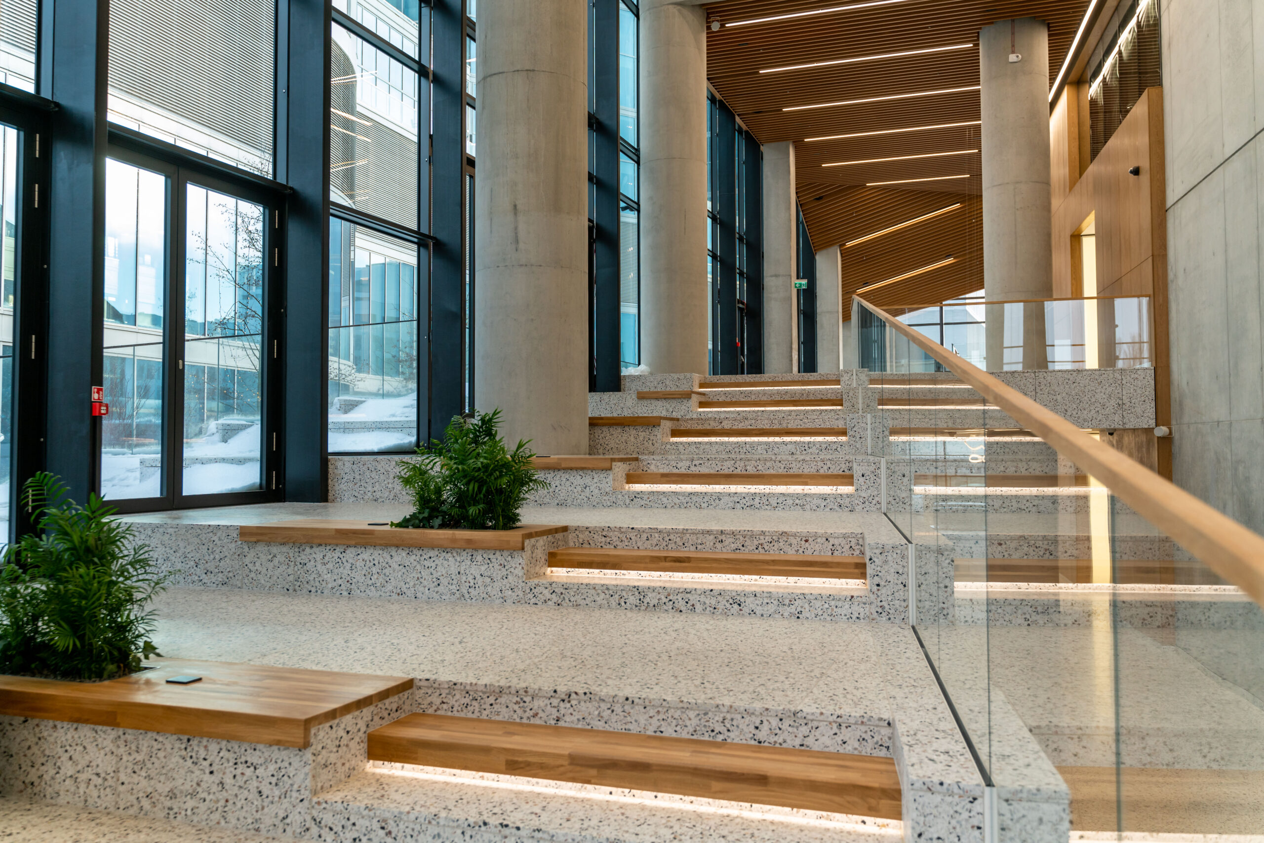 Jednak najważniejsze jest to, że idąc dziś do pracy czy na spotkanie, chcemy być pozytywnie zaskoczeni, zainspirowani – czy to ciekawą, budzącą pozytywne emocje architekturą, sztuką, naturalną zielenią, wspierającą technologią, czy także rozwiązaniami, które sprzyjają nawet przypadkowym społecznym kontaktom, czyli rozwiązaniami dospołecznymi. Należy do takich tworzenie w przestrzeniach ogólnodostępnych lobby wejściowego wielofunkcyjnej strefy, w której można zaczekać w wygodnych, różnorodnych siedziskach, popracować, zrobić sobie kawę lub herbatę, nalać wodę, zamienić z kimś kilka słów, przygotować się do spotkania, zrelaksować się, krótko mówiąc – poczuć się jak w gościnnym domu. To, czego również oczekujemy, to poczucie przynależności do przestrzeni, wrażenia, że to miejsce stworzone jest dla mnie i że mogę ewentualnie w określonej przestrzeni dostosować to wnętrze do swoich potrzeb. Równolegle chcemy spójności przestrzeni, chcemy czuć w różnych miejscach budynku, że w tej architekturze – od decyzji o lokalizacji budynku, przez formę architektury, funkcję, aż po materiały i rozwiązania – projektanci opowiedzieli jedną spójną historię, zrozumiałą dla użytkowników.