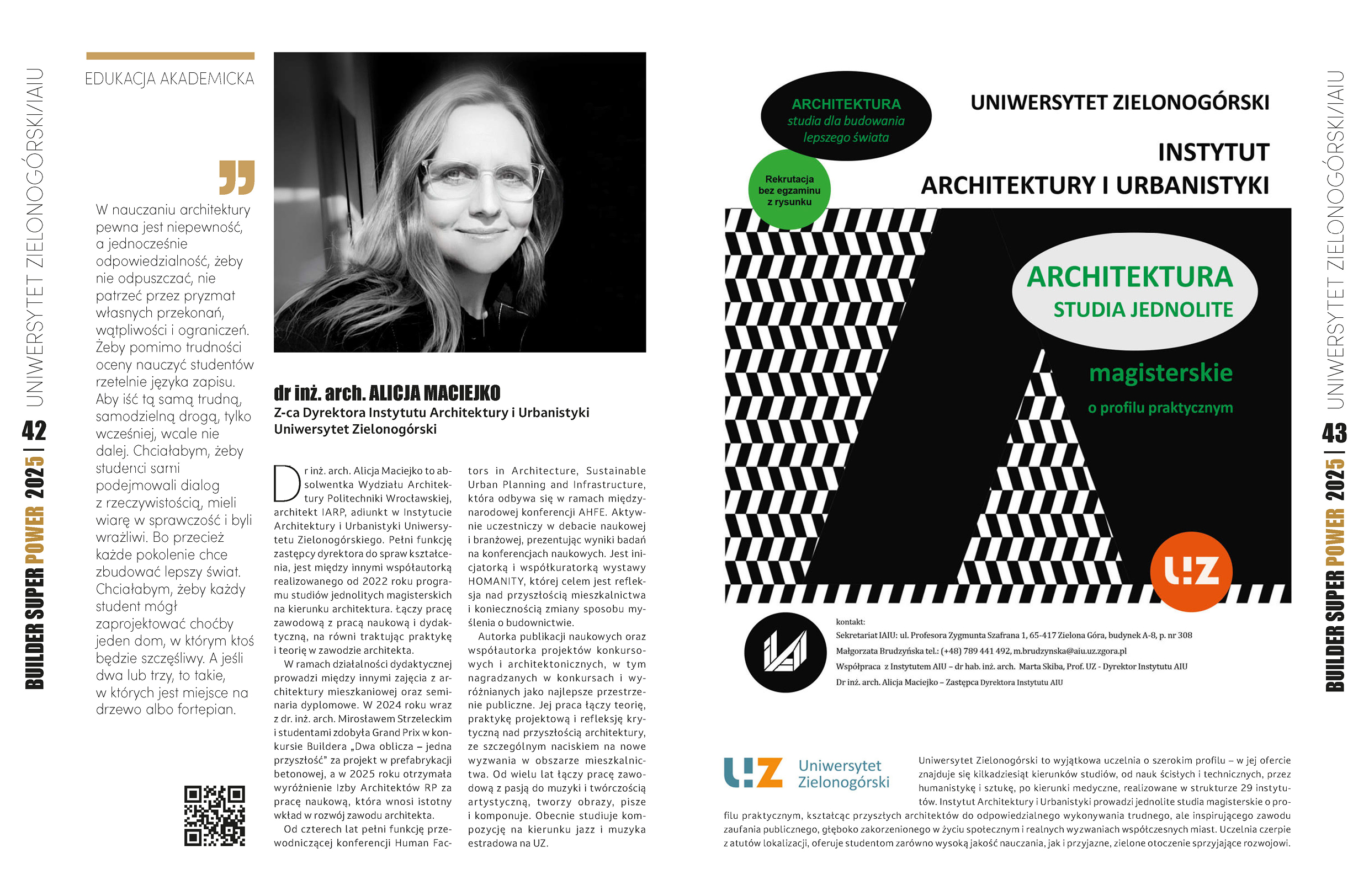 Dr inż. arch. Alicja Maciejko to absolwentka Wydziału Architektury Politechniki Wrocławskiej, architekt IARP, adiunkt w Instytucie Architektury i Urbanistyki Uniwersytetu Zielonogórskiego. Pełni funkcję zastępcy dyrektora do spraw kształcenia, jest między innymi współautorką realizowanego od 2022 roku programu studiów jednolitych magisterskich na kierunku architektura. Łączy pracę zawodową z pracą naukową i dydaktyczną, na równi traktując praktykę i teorię w zawodzie architekta. W ramach działalności dydaktycznej prowadzi między innymi zajęcia z architektury mieszkaniowej oraz seminaria dyplomowe. W 2024 roku wraz z dr. inż. arch. Mirosławem Strzeleckim i studentami zdobyła Grand Prix w konkursie Buildera „Dwa oblicza – jedna przyszłość” za projekt w prefabrykacji betonowej, a w 2025 roku otrzymała wyróżnienie Izby Architektów RP za pracę naukową, która wnosi istotny wkład w rozwój zawodu architekta.