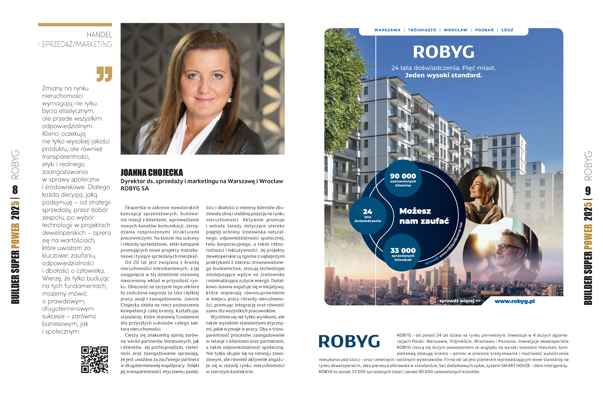 Od 20 lat jest związana z branżą nieruchomości mieszkaniowych, a jej osiągnięcia w tej dziedzinie stanowią nieoceniony wkład w przyszłość rynku. Obecność na szczycie tego sektora to zasłużona nagroda za lata ciężkiej pracy, pasji i zaangażowania. Joanna Chojecka działa na rzecz podnoszenia kompetencji całej branży, kształtując standardy, które stanowią fundament dla p rzyszłych s ukcesów c ałego s ektora nieruchomości.