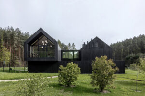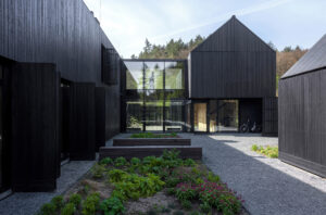Bryły tworzące zabudowę to kubatury nawiązujące do wzorca tzw. nowoczesnej stodoły. Motyw ten, obecny dziś w wielu realizacjach, nie tylko mieszkalnych, przywołuje formę wydłużonego prostokąta z dwuspadowym dachem, najczęściej pozbawionym okapu. W projekcie skala i charakter każdej z brył zostały dostosowane do ich funkcji.