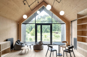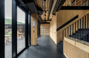 Jednym z kluczowych założeń zrównoważonego rozwoju jest wykorzystywanie potencjału lokalnego, wynikającego z uwarunkowań środowiskowych, przyrodniczych i kulturowych. To świadomy wybór lokalnych surowców, tradycyjnego rzemiosła i regionalnego dziedzictwa, połączony z poszukiwaniem współczesnych odniesień do historycznej zabudowy. W projekcie ta lokalność objawia się powrotem do architektury drewnianej – nowoczesną interpretacją budownictwa zagrodowego. Wybrano technologię CLT, którą zastosowano zarówno do konstrukcji, jak i do wykończenia wnętrz, wpływając równocześnie na ekonomię inwestycji. CLT wyróżniają wysoka wytrzymałość przy niewielkich przekrojach, znakomite parametry akustyczne i termiczne oraz krótki czas montażu dzięki prefabrykacji. Zaawansowany proces produkcji i suszenia eliminuje ryzyko pojawienia się owadów, grzybów czy innych szkodników. Grubość elementów i liczba warstw zależą przede wszystkim od wymagań konstrukcyjnych i przeciwpożarowych.