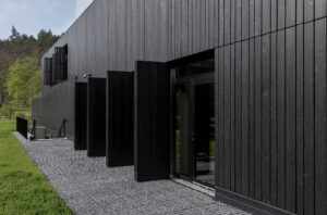 Drugi trudny element projektu stanowiła elewacja z desek opalanych. O ile na świecie były realizowane budynki w takim wykończeniu, w Polsce w 2016 r. opalane drewno spotykano jedynie w rozwiązaniach wnętrzarskich. Wówczas istniało również niewiele firm, które zajmowałyby się wykonywaniem produktu jako elewacji. Jednocześnie w przypadku budynku użyteczności publicznej należy wykonać zgodnie z przepisami fasadę jako NRO – nierozprzestrzeniającą ognia. O ile można zakupić produkt, który zabezpieczy naturalną deskę drewnianą, o tyle surowiec poddany płomieniom ognia nie jest – zgodnie z nomenklaturą prawną – uważany za drewno naturalne, a więc nie można było uznać, że po pokryciu impregnatem spełni wymogi przepisów. Dzięki współpracy z lokalną firmą Custom Zole udało się przygotować próbki fasady, które zostały wykorzystane zarówno do oceny estetycznej rozwiązania, jak i do badań w Instytucie Techniki Budowlanej. Ostatecznie uzyskane zostało jednostkowe dopuszczenie deski pokrytej konkretnym produktem, który zapewnił oczekiwane parametry odporności ogniowej.
