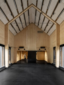 Budynek nie ukrywa swojej konstrukcji. Poza główną salą ekspozycyjną, gdzie wprowadzono panele akustyczne, wszystkie pozostałe pomieszczenia pozbawione są sufitów podwieszanych, eksponując też część technologiczną. Widoczne pozostają stalowe łączniki elementów drewnianych z płytą fundamentową oraz między sobą. Prefabrykaty CLT tworzą wykończenie wnętrz, odsłaniając zarówno swoją rolę konstrukcyjną, jak i warstwową strukturę – w zależności od układu widać kierunki usłojenia, ponad otworami ujawniają się belki, a w stropach przekroje płyt. Wierzchnia warstwa zachowuje naturalny koloryt i fakturę.