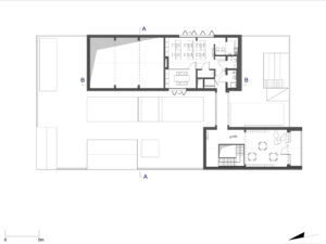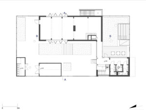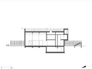 Aby uniknąć realizacji wielkogabarytowego obiektu, zagospodarowanie tworzy zespół rozproszonych brył, spiętych jednorodnym ogrodzeniem, które wyznacza dwa różne w charakterze dziedzińce. Wszystkie wejścia do budynku odbywają się poprzez składane bramy. Pierwszy dziedziniec stanowi strefę wejściową i równocześnie przejście do ogrodu – w jego centrum znajduje się drewniane patio z ławkami i towarzyszącą zielenią. Drugi ma charakter bardziej kameralny – dostępny przez hol budynku, zlokalizowany za tarasem i niewielkim amfiteatrem, będącym miejscem spotkań i zajęć pod chmurką.