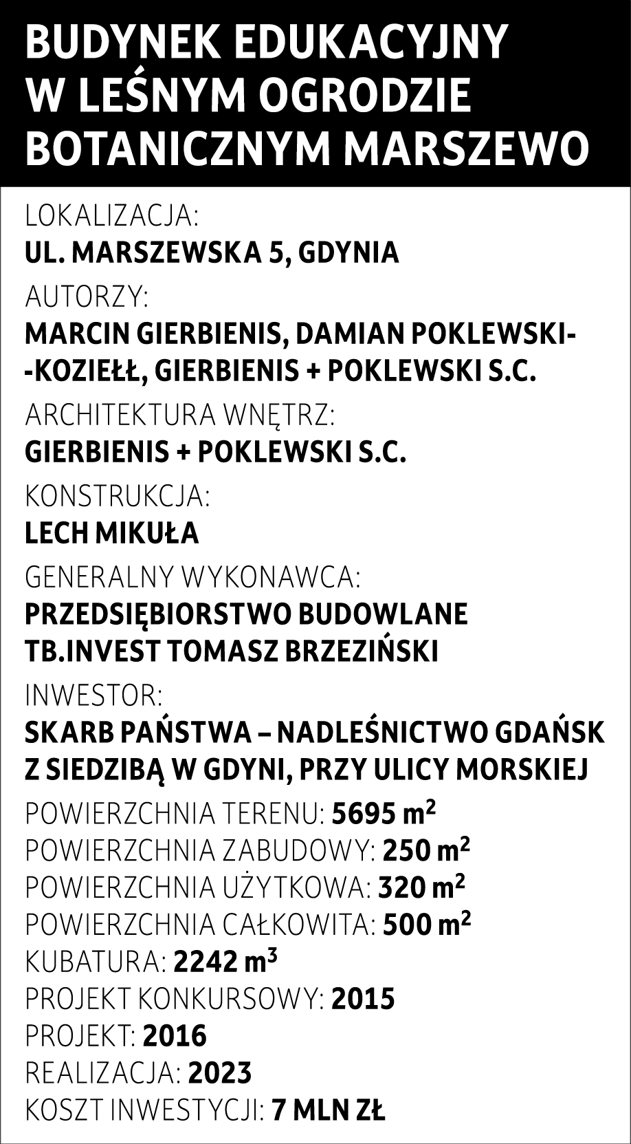 Budynek Edukacyjny w Leśnym Ogrodzie Botanicznym Marszewo powstał z idei promocji nowoczesnego budownictwa drewnianego oraz projektowania ukierunkowanego na tworzenie interakcji między ludźmi i naturą. Te światy płynnie się łączą, przenikają, pozwalając na synergię.