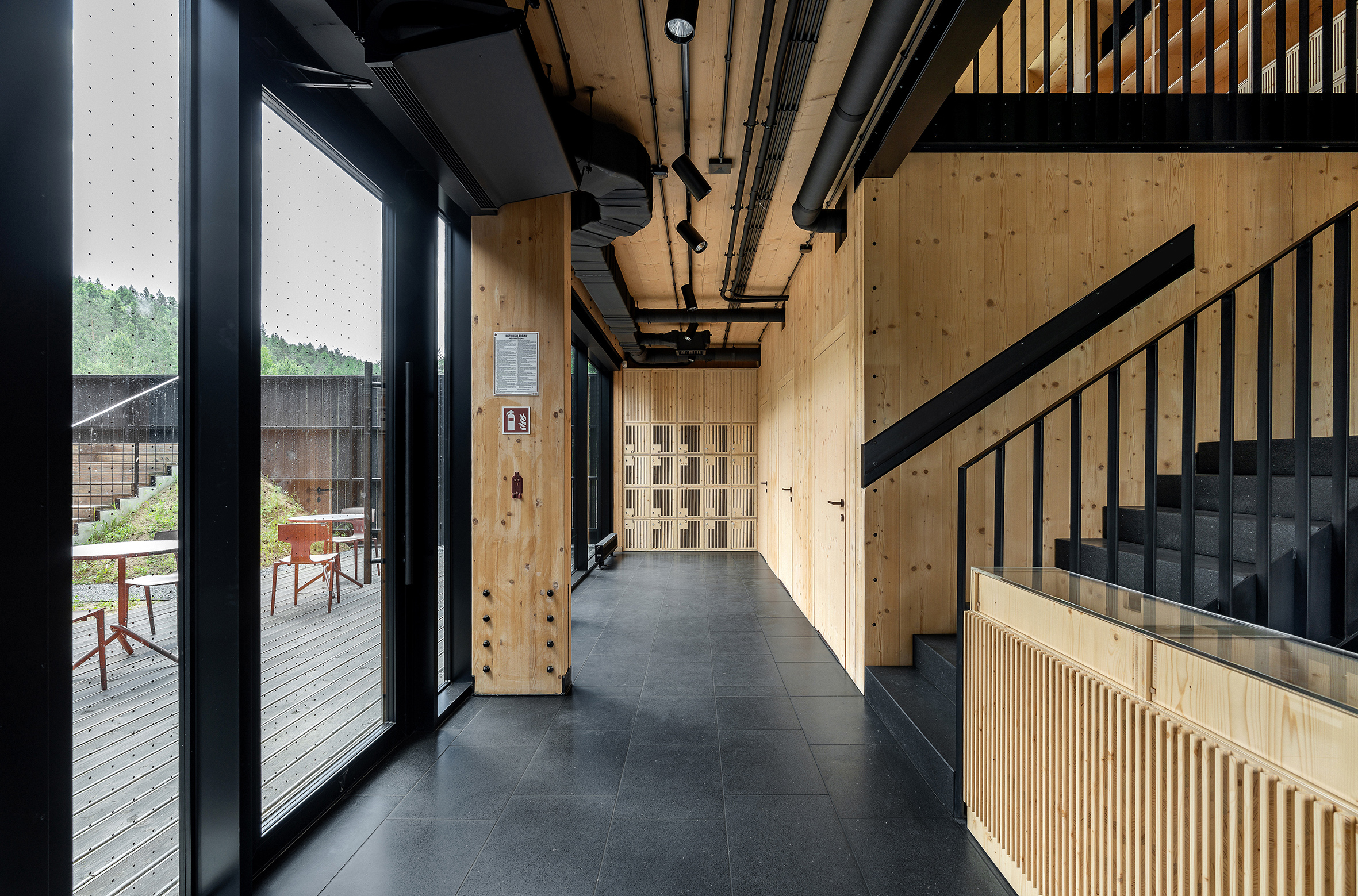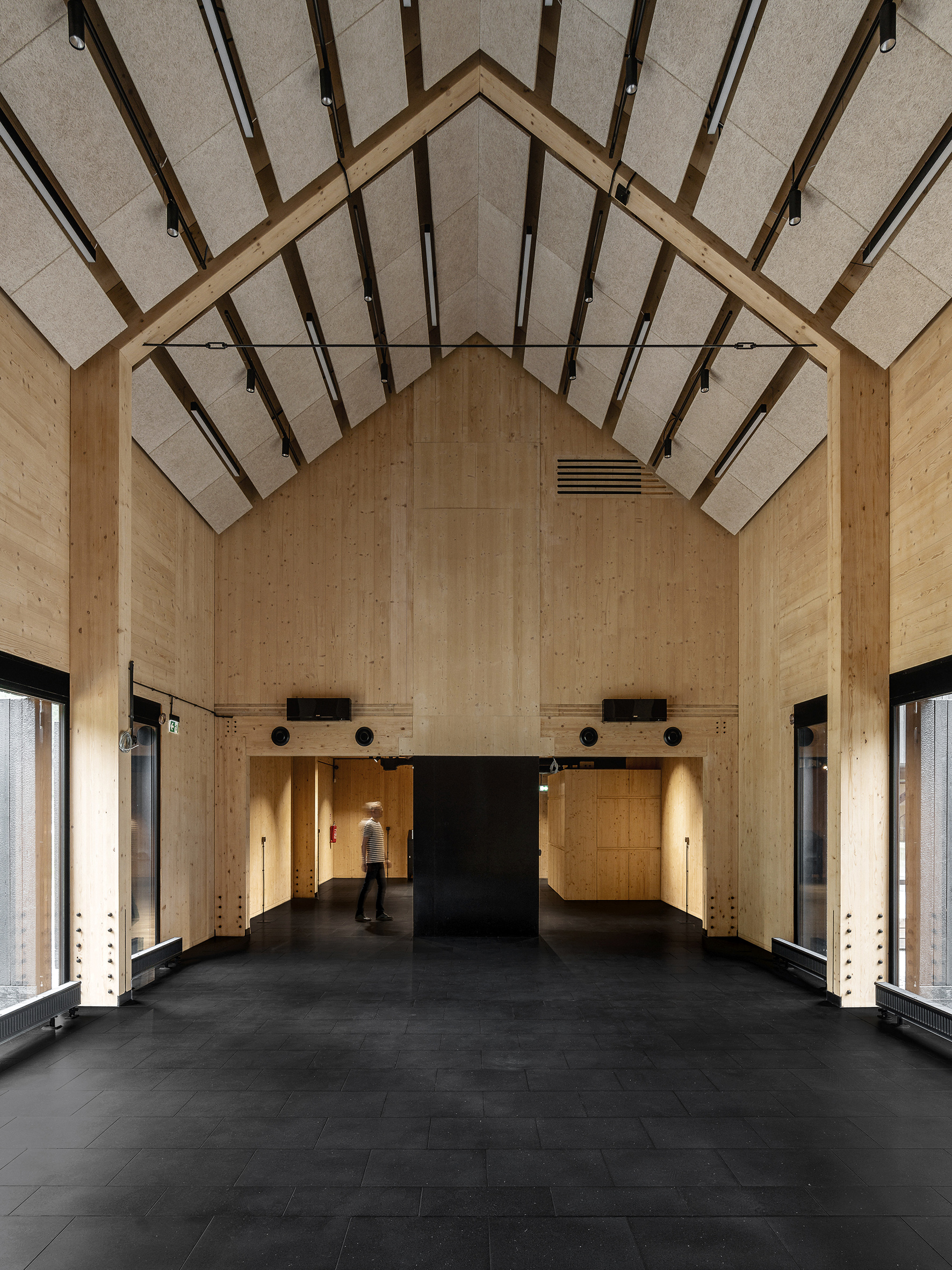 Budynek nie ukrywa swojej konstrukcji. Poza główną salą ekspozycyjną, gdzie wprowadzono panele akustyczne, wszystkie pozostałe pomieszczenia pozbawione są sufitów podwieszanych, eksponując też część technologiczną. Widoczne pozostają stalowe łączniki elementów drewnianych z płytą fundamentową oraz między sobą. Prefabrykaty CLT tworzą wykończenie wnętrz, odsłaniając zarówno swoją rolę konstrukcyjną, jak i warstwową strukturę – w zależności od układu widać kierunki usłojenia, ponad otworami ujawniają się belki, a w stropach przekroje płyt. Wierzchnia warstwa zachowuje naturalny koloryt i fakturę.