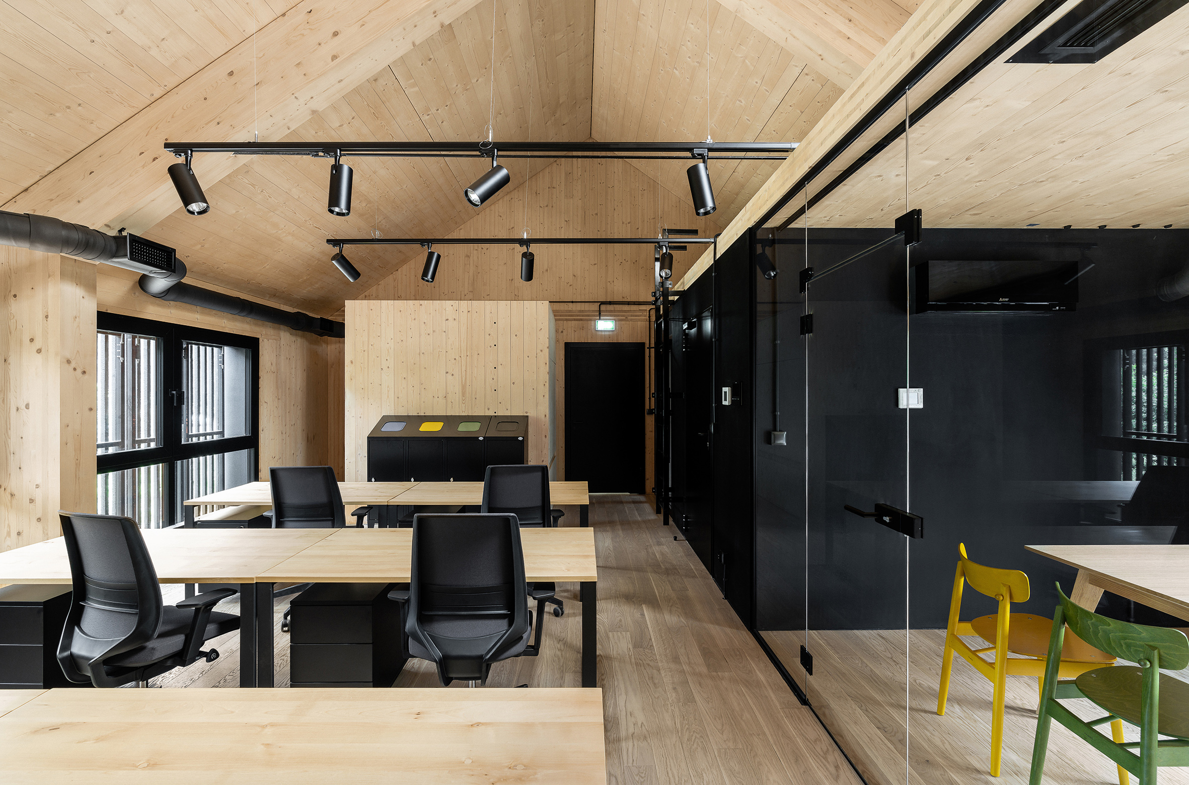 Jednym z kluczowych założeń zrównoważonego rozwoju jest wykorzystywanie potencjału lokalnego, wynikającego z uwarunkowań środowiskowych, przyrodniczych i kulturowych. To świadomy wybór lokalnych surowców, tradycyjnego rzemiosła i regionalnego dziedzictwa, połączony z poszukiwaniem współczesnych odniesień do historycznej zabudowy. W projekcie ta lokalność objawia się powrotem do architektury drewnianej – nowoczesną interpretacją budownictwa zagrodowego. Wybrano technologię CLT, którą zastosowano zarówno do konstrukcji, jak i do wykończenia wnętrz, wpływając równocześnie na ekonomię inwestycji. CLT wyróżniają wysoka wytrzymałość przy niewielkich przekrojach, znakomite parametry akustyczne i termiczne oraz krótki czas montażu dzięki prefabrykacji. Zaawansowany proces produkcji i suszenia eliminuje ryzyko pojawienia się owadów, grzybów czy innych szkodników. Grubość elementów i liczba warstw zależą przede wszystkim od wymagań konstrukcyjnych i przeciwpożarowych.