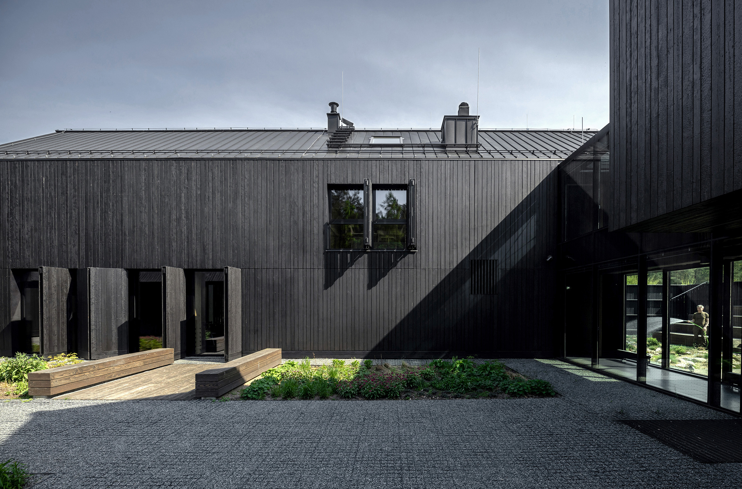 Drugi trudny element projektu stanowiła elewacja z desek opalanych. O ile na świecie były realizowane budynki w takim wykończeniu, w Polsce w 2016 r. opalane drewno spotykano jedynie w rozwiązaniach wnętrzarskich. Wówczas istniało również niewiele firm, które zajmowałyby się wykonywaniem produktu jako elewacji. Jednocześnie w przypadku budynku użyteczności publicznej należy wykonać zgodnie z przepisami fasadę jako NRO – nierozprzestrzeniającą ognia. O ile można zakupić produkt, który zabezpieczy naturalną deskę drewnianą, o tyle surowiec poddany płomieniom ognia nie jest – zgodnie z nomenklaturą prawną – uważany za drewno naturalne, a więc nie można było uznać, że po pokryciu impregnatem spełni wymogi przepisów. Dzięki współpracy z lokalną firmą Custom Zole udało się przygotować próbki fasady, które zostały wykorzystane zarówno do oceny estetycznej rozwiązania, jak i do badań w Instytucie Techniki Budowlanej. Ostatecznie uzyskane zostało jednostkowe dopuszczenie deski pokrytej konkretnym produktem, który zapewnił oczekiwane parametry odporności ogniowej.