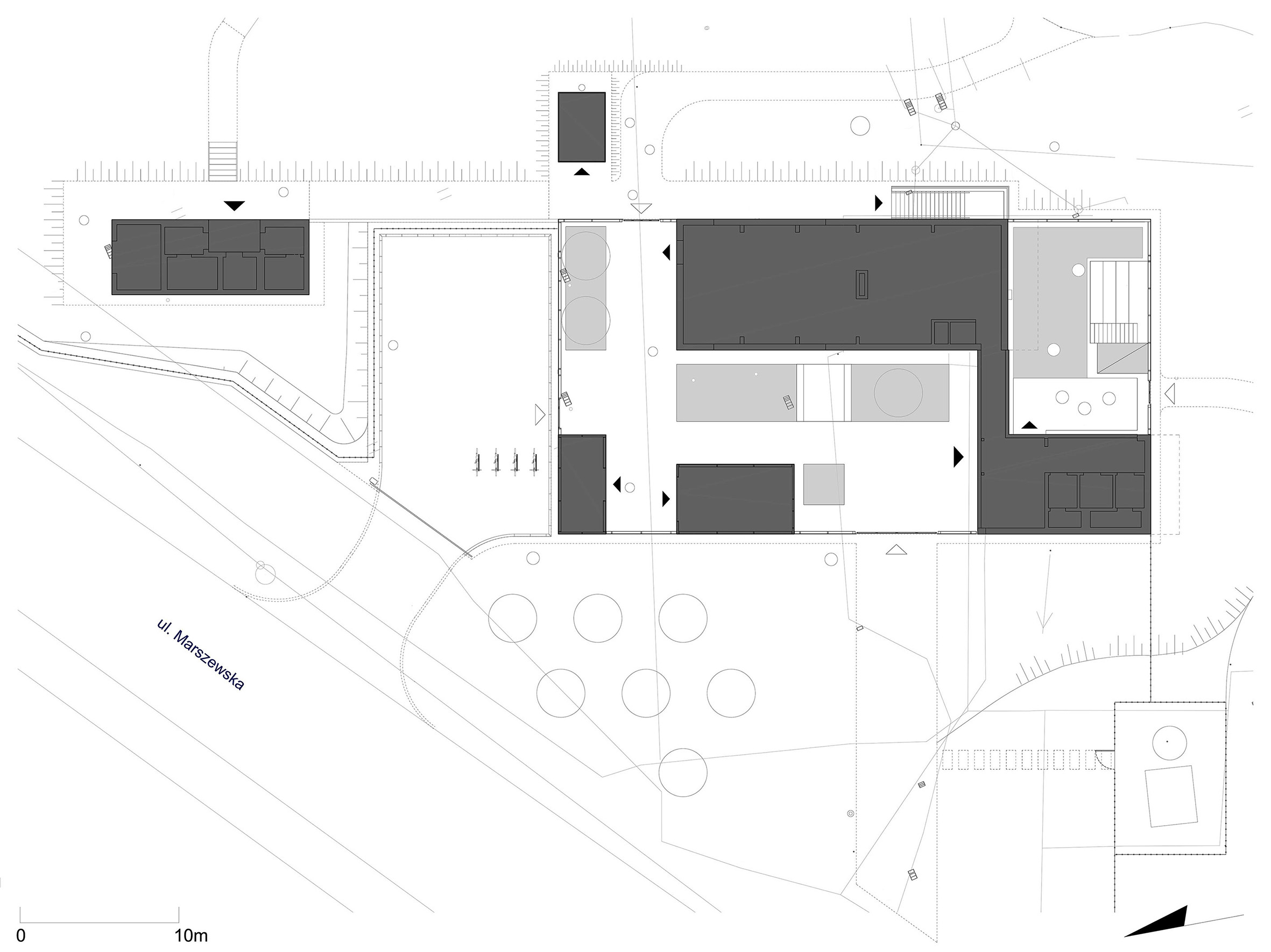 Nowy budynek został zrealizowany dokładnie w miejscu wyburzonego obiektu, przy założeniu jak najmniejszego wpływu na zastany, naturalny ekosystem i wraz z uniknięciem zaburzenia bioróżnorodności zbytnią urbanizacją. Projektowane zagospodarowanie przewidywało pozostawienie znacznej powierzchni zielonej oraz zastosowanie nawierzchni przepuszczalnych, aby nie naruszyć gospodarki wodnej – część wód opadowych jest odprowadzana do pobliskiego oczka wodnego.