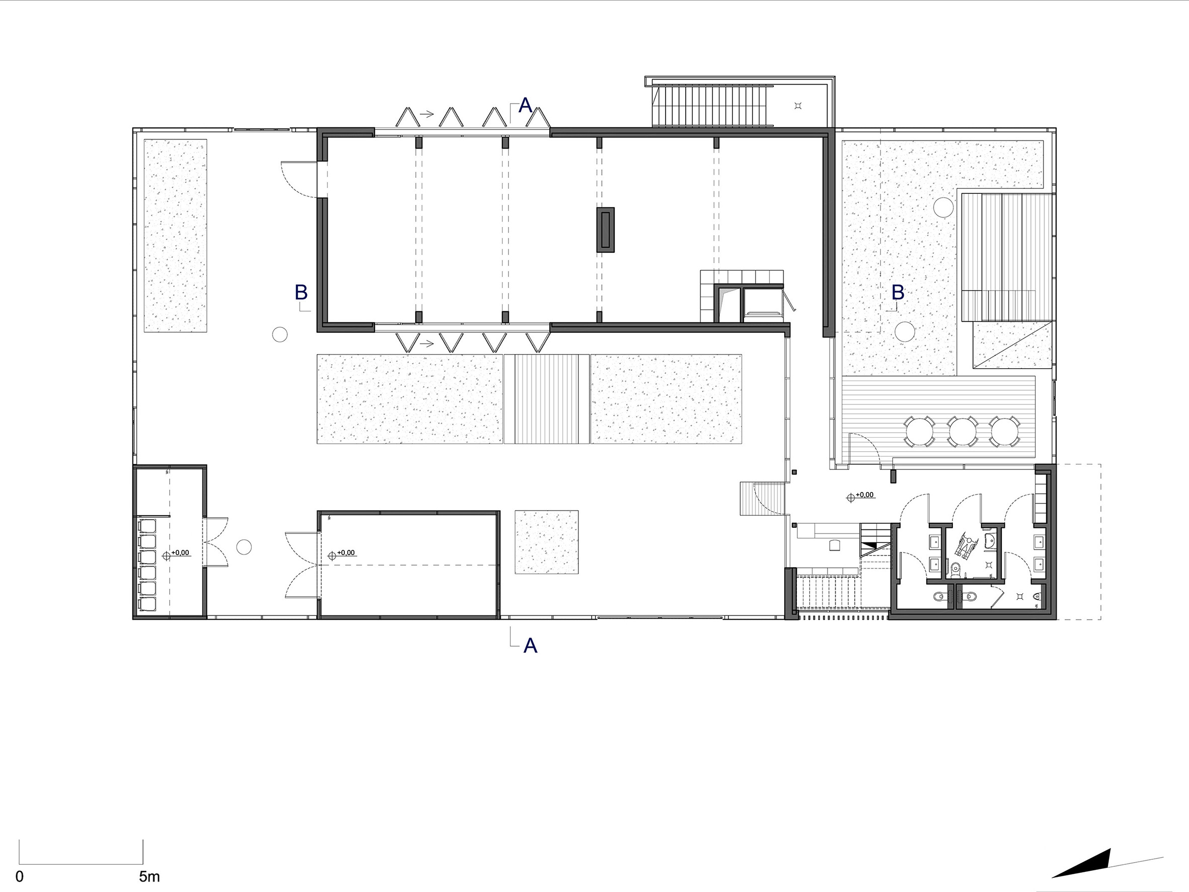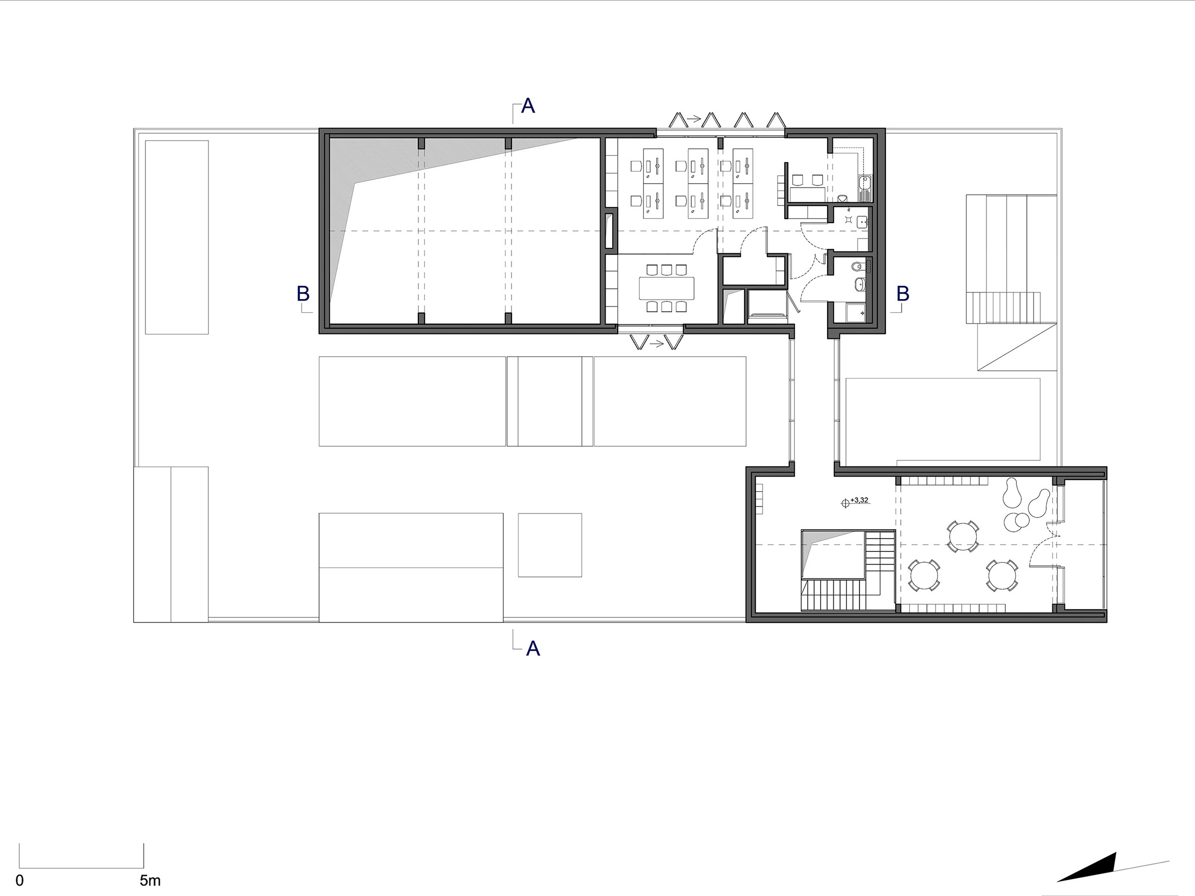 Aby uniknąć realizacji wielkogabarytowego obiektu, zagospodarowanie tworzy zespół rozproszonych brył, spiętych jednorodnym ogrodzeniem, które wyznacza dwa różne w charakterze dziedzińce. Wszystkie wejścia do budynku odbywają się poprzez składane bramy. Pierwszy dziedziniec stanowi strefę wejściową i równocześnie przejście do ogrodu – w jego centrum znajduje się drewniane patio z ławkami i towarzyszącą zielenią. Drugi ma charakter bardziej kameralny – dostępny przez hol budynku, zlokalizowany za tarasem i niewielkim amfiteatrem, będącym miejscem spotkań i zajęć pod chmurką.