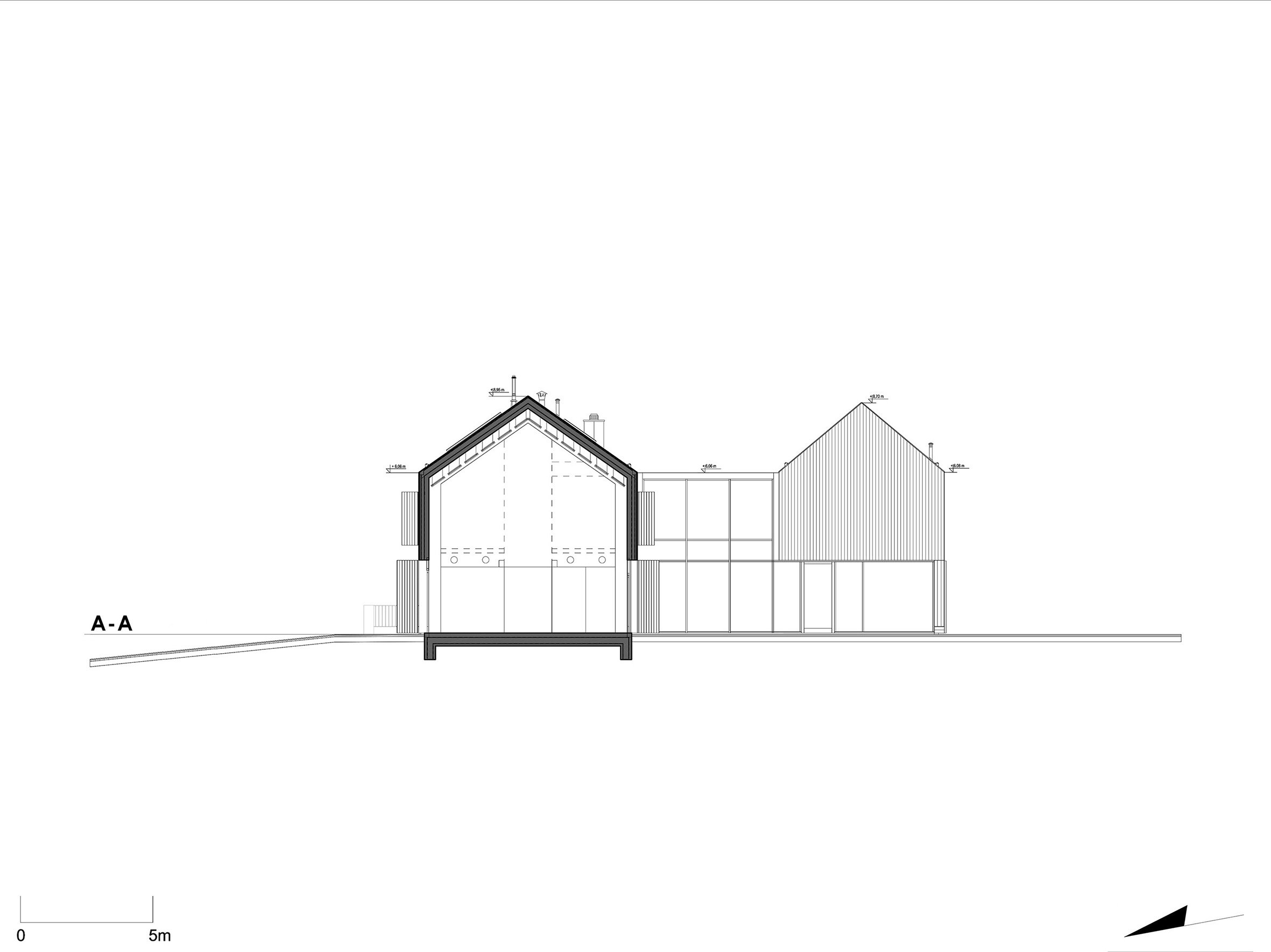 Bryły tworzące zabudowę to kubatury nawiązujące do wzorca tzw. nowoczesnej stodoły. Motyw ten, obecny dziś w wielu realizacjach, nie tylko mieszkalnych, przywołuje formę wydłużonego prostokąta z dwuspadowym dachem, najczęściej pozbawionym okapu. W projekcie skala i charakter każdej z brył zostały dostosowane do ich funkcji.