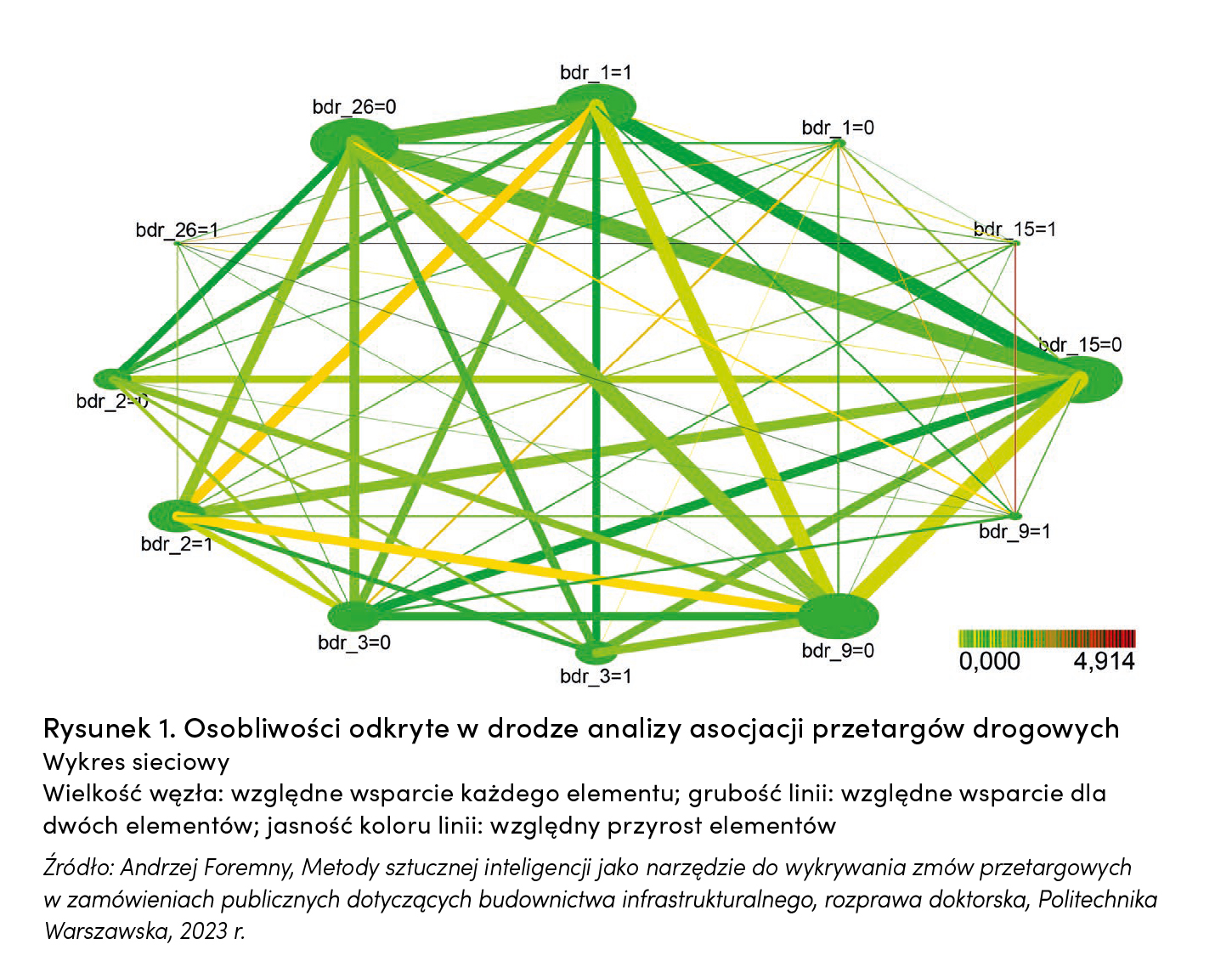 Kolejnym przykładem może być wieloagentowy system do wspomagania decyzji o zakupie nieruchomości. Istnieją aplikacje do tworzenia wstępnych analiz chłonności, a odpowiednio wytrenowane i skonfigurowane LLM-y mogą w kilka minut przeanalizować dokumenty dotyczące działki, takie jak: WZ/MPZP, koncepcje, media, infrastruktura, decyzje administracyjne, korespondencja, analiza konkurencji w okolicy. Czynności dotychczas przeprowadzane przez zespół interdyscyplinarny (inżynierowie, prawnicy, specjaliści) mogą zostać już dzisiaj wstępnie wykonane przez tego typu narzędzia. W praktyce okazuje się, że taka wirtualna dyskusja wyspecjalizowanych agentów AI przynosi lepsze efekty niż pojedynczego z wiedzą ogólną. Analiza danych może również zostać wykorzystana do wykrywania nadużyć przy przetargach budowlanych. Na rysunku 1 zaprezentowano wyniki analizy asocjacji dla wybranych 386 przetargów drogowych. Co wynika z tego wykresu? Chociażby to, że oferenci bdr_9, bdr_15 i bdr_26 wzięli udział tylko w takich przetargach, gdzie nie był obecny bdr_3. Relacje te są widoczne na wykresie, objawiają się dużymi węzłami dla trójki oferentów oraz dość grubymi liniami łączącymi węzeł każdego z nich z węzłem bdr_3=0.