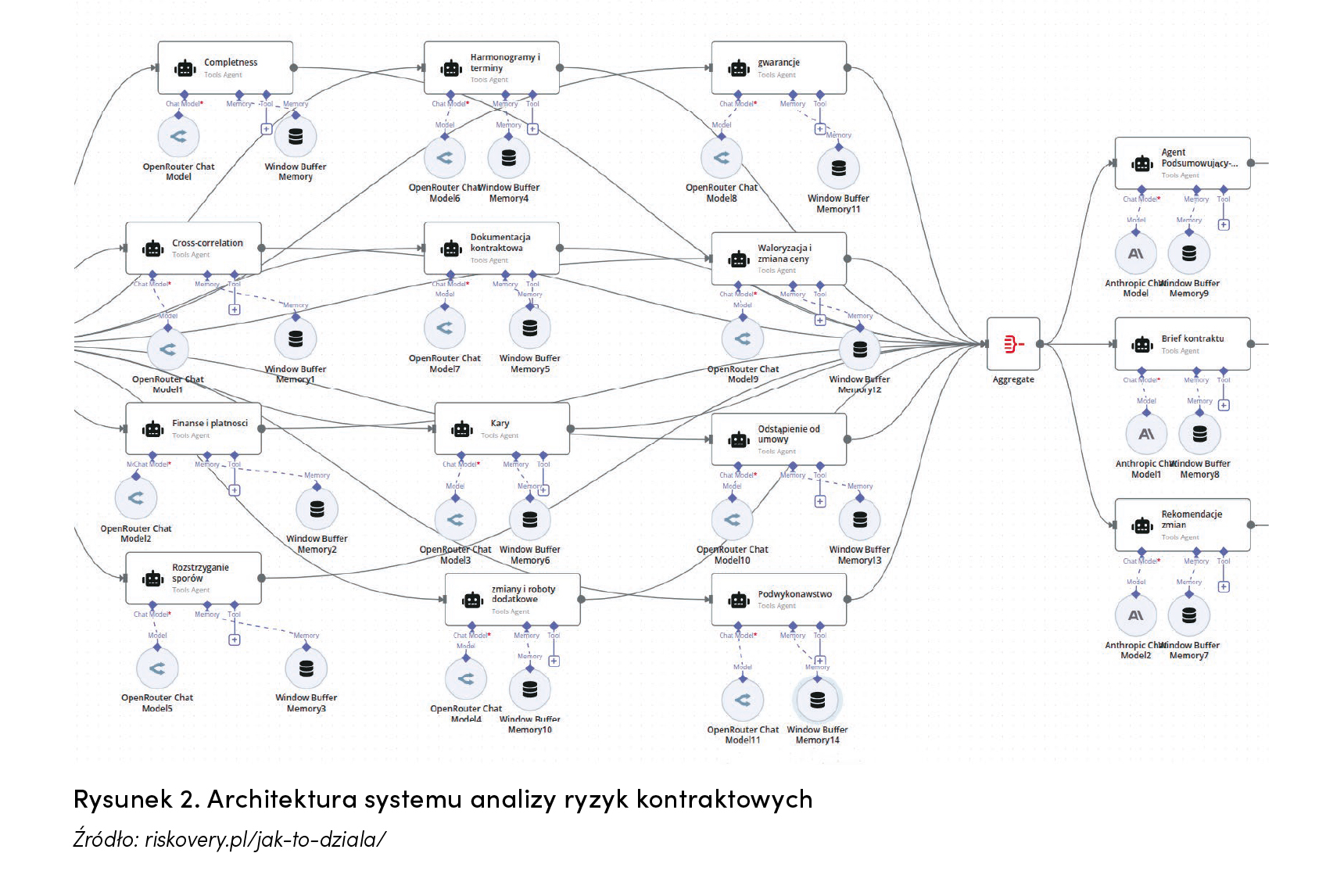 Rysunek 2 przedstawia architekturę systemu AI służącego do zautomatyzowanej analizy ryzyk kontraktowych wykonawcy robót budowlanych. W przyszłości proces kontraktowania i budowania będzie coraz bardziej zautomatyzowany z powodu rosnących kosztów pracy i coraz niższych kosztów automatyzacji/robotyzacji.